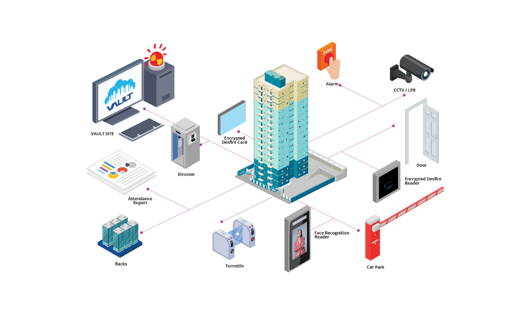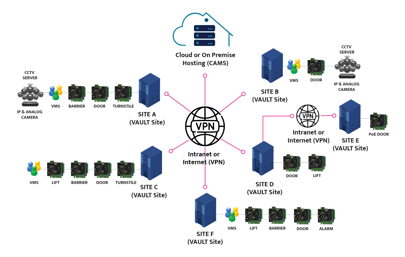 VAULT Site works in conjunction with site controllers (doors, turnstiles, elevators, lockers/racks, gates/barriers, etc.), feeding them with the business rules and receiving their transactions.