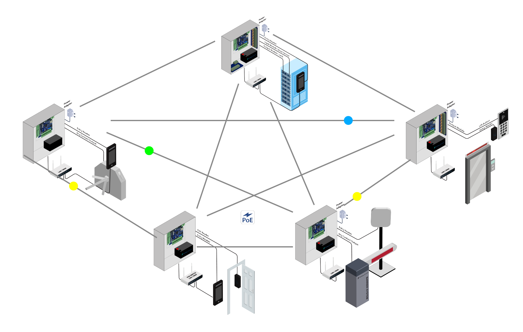 Controllers communicate point to point, amongst themselves, therefore alarm signals are transmitted without the need of an on-line server, make up one of the most complete and versatile solutions in the world market.